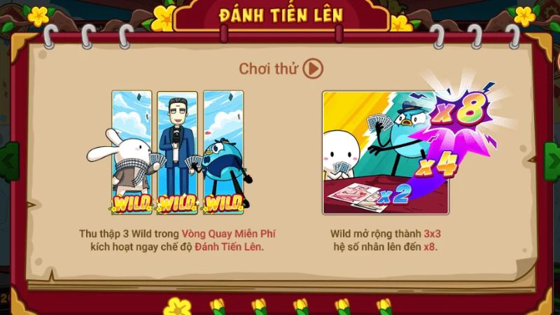 Khi người chơi quay trúng 3 biểu tượng Scatter (Én cầm bài), hệ thống sẽ kích hoạt 10 lượt quay miễn phí, trong đó tỷ lệ xuất hiện Wild (Thỏ Bảy Màu đội nón lá) tăng cao, kèm các vòng ngẫu nhiên nhận hệ số thưởng x2, x3, x5, giúp tiền thưởng nhân nhanh đáng kể. Đặc biệt, nếu tiếp tục quay ra Scatter trong các lượt miễn phí, bạn sẽ được cộng thêm lượt quay, kéo dài cơ hội săn thưởng lớn.